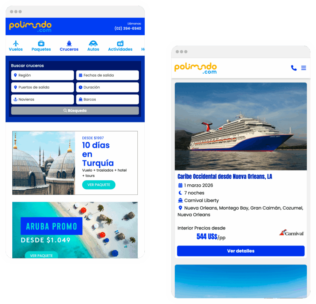 Polimundo partnered with Traveltek to implement its latest front-end cruise solution called Cruise Website Builder, enabling them to: